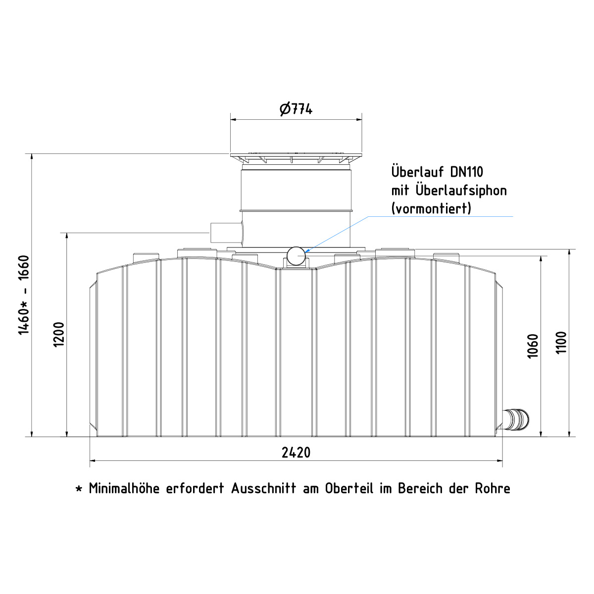 Im Fall einer geringeren Einbautiefe vor Ort als die vorhandene Gesamthöhe des Tanks, ist es erforderlich, im oberen Teil der Abdeckung einen Ausschnitt für den Zulauf zu erstellen, da dieser fest installiert ist (s. Abbildung). Dieses ist jedoch mit Hilfe einer Stichsäge einfach und schnell durchgeführt.