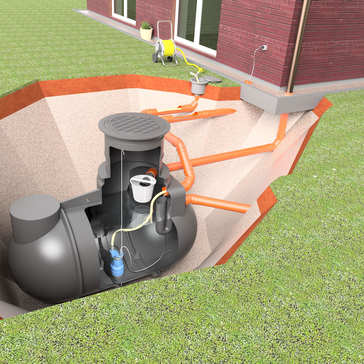 Funktionsweise: Das anfallende Regenwasser wird über ein oder mehrere Fallrohre in die Zisterne geleitet. Der vormontierte Filterkorb entfernt die Feststoffe und kann zur Reinigung entnommen werden. Die im Tank befindliche Tauchdruckpumpe "GAP X80" oder die besonders leistungsstarke "Tauchdruckpumpe GAP X120" versorgt über den Druckschlauch die frei im Garten platzierbare Wasseranschluss-Box. Zur Wasserentnahme einfach den Gartenschlauch an der Wasseranschlussbox aufstecken (Klick-System) - fertig! Beim Aufdrehen der Spritzdüse des Gartenschlauches, schaltet sich die Pumpe automatisch ein und beim Schließen wieder aus. Die Pumpe verfügt über einen integrierten Trockenlaufschutz (bei leerer Zisterne).