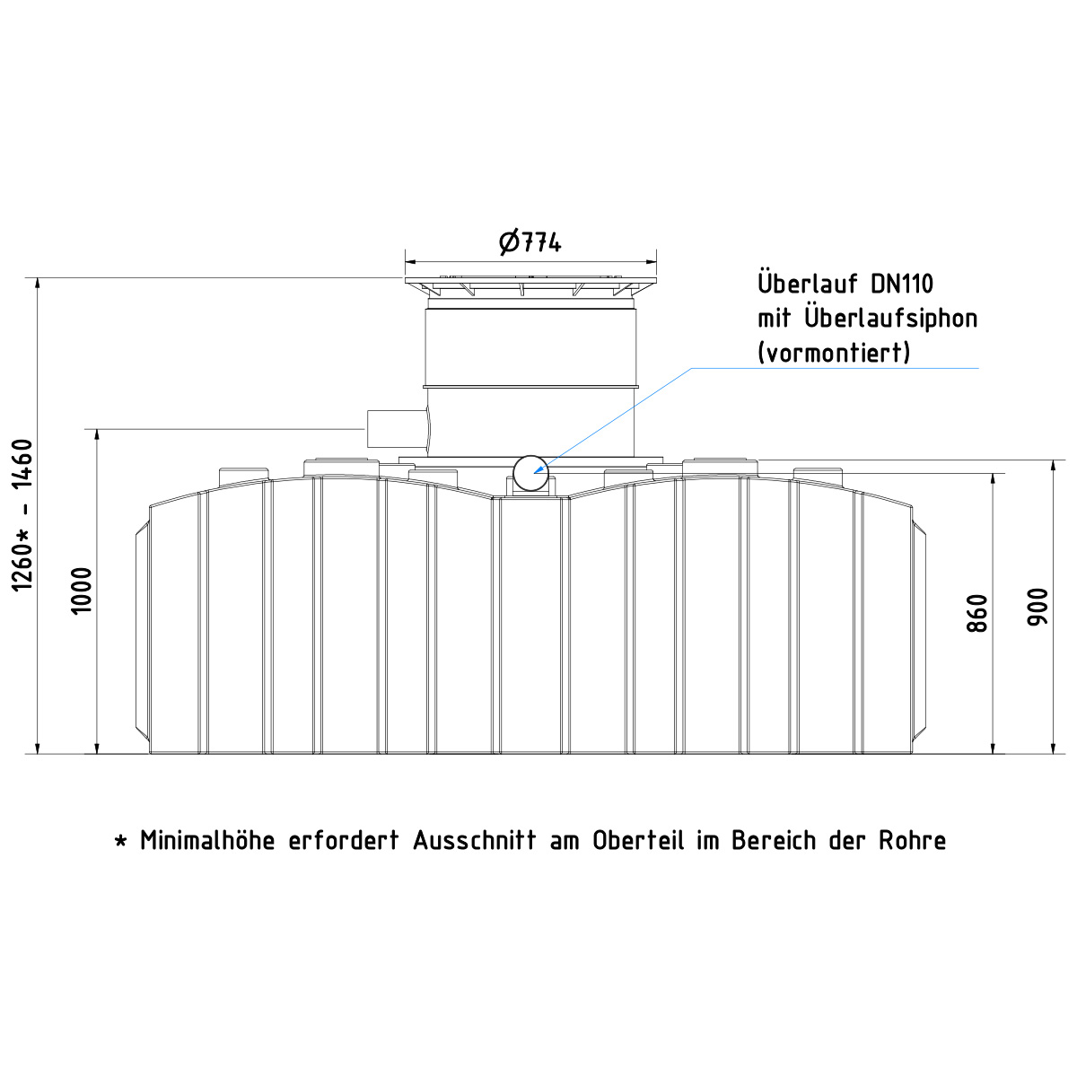 Im Fall einer geringeren Einbautiefe vor Ort als die vorhandene Gesamthöhe des Tanks, ist es erforderlich, im oberen Teil der Abdeckung einen Ausschnitt für den Zulauf zu erstellen, da dieser fest installiert ist (s. Abbildung). Dieses ist jedoch mit Hilfe einer Stichsäge einfach und schnell durchgeführt.