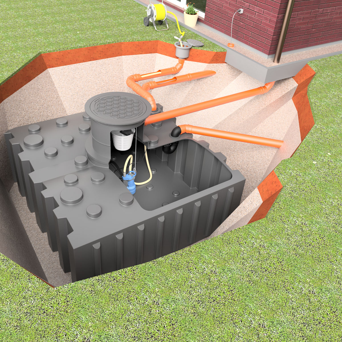 Funktionsweise: Das anfallende Regenwasser wird über ein oder mehrere Fallrohre in die Zisternen geleitet. Der vormontierte Filterkorb entfernt die Feststoffe und kann zur Reinigung entnommen werden. Die im Tank befindliche Tauchdruckpumpe "GAP X80" oder die besonders leistungsstarke "Tauchdruckpumpe GAP X120" versorgt über den Druckschlauch die frei im Garten platzierbare Wasseranschluss-Box. Zur Wasserentnahme einfach den Gartenschlauch an der Wasseranschlussbox aufstecken (Klick-System) - fertig! Beim Aufdrehen der Spritzdüse des Gartenschlauches, schaltet sich die Pumpe automatisch ein und beim Schließen wieder aus. Die Pumpe verfügt über einen integrierten Trockenlaufschutz (bei leerer Zisterne).