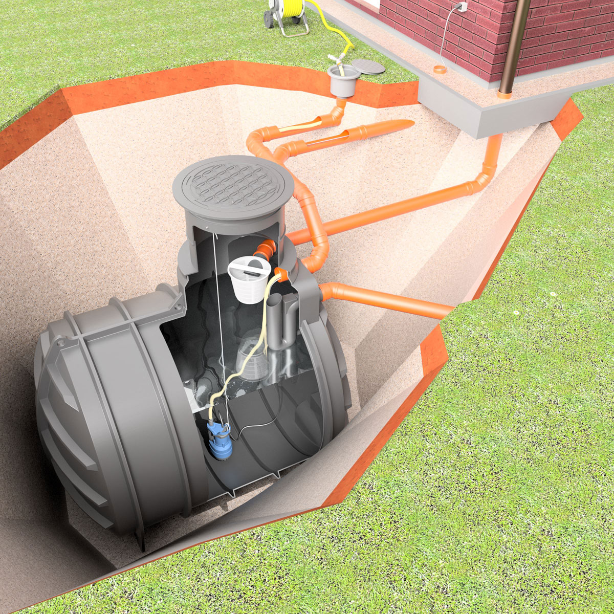 Funktionsweise: Das anfallende Regenwasser wird über ein oder mehrere Fallrohre in die Zisterne geleitet. Der vormontierte Filterkorb entfernt die Feststoffe und kann zur Reinigung entnommen werden. Die im Tank befindliche Tauchdruckpumpe "GAP X80" oder die besonders leistungsstarke "Tauchdruckpumpe GAP X120" versorgt über den Druckschlauch die frei im Garten platzierbare Wasseranschluss-Box. Zur Wasserentnahme einfach den Gartenschlauch an der Wasseranschlussbox aufstecken (Klick-System) - fertig! Beim Aufdrehen der Spritzdüse des Gartenschlauches, schaltet sich die Pumpe automatisch ein und beim Schließen wieder aus. Die Pumpe verfügt über einen integrierten Trockenlaufschutz (bei leerer Zisterne).