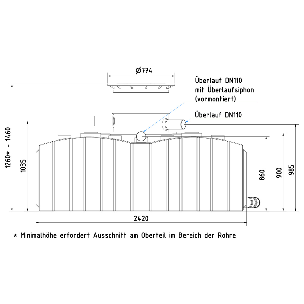 Im Fall einer geringeren Einbautiefe vor Ort als die vorhandene Gesamthöhe des Tanks, ist es erforderlich, im oberen Teil der Abdeckung einen Ausschnitt für den Zulauf zu erstellen, da dieser fest installiert ist (s. Abbildung). Dieses ist jedoch mit Hilfe einer Stichsäge einfach und schnell durchgeführt.