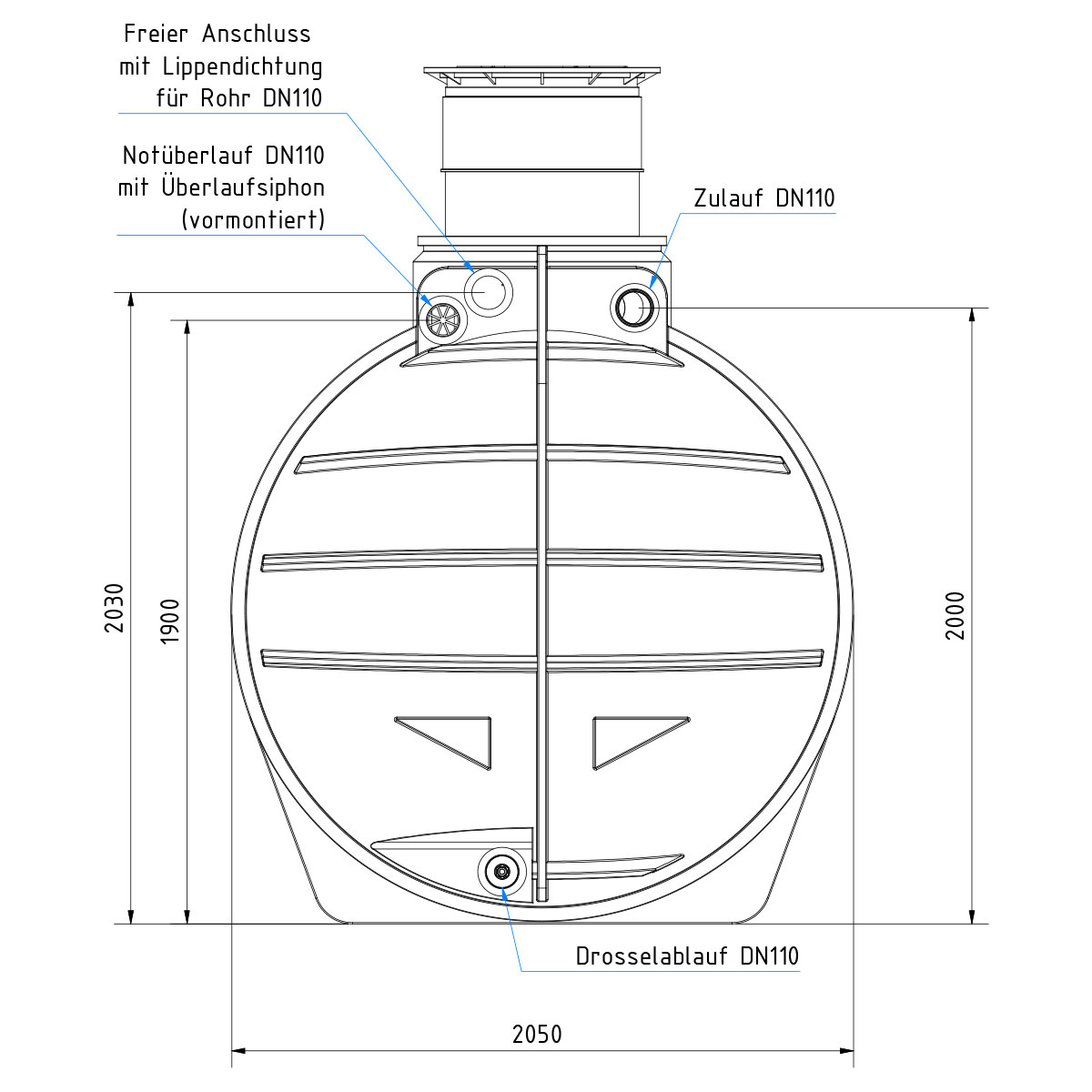 Funktionsbeispiel basierend auf einer Retentionszisterne mit 4450 L Volumen. Bestandteile und Funktion sind bei allen Retentionszisternen identisch.