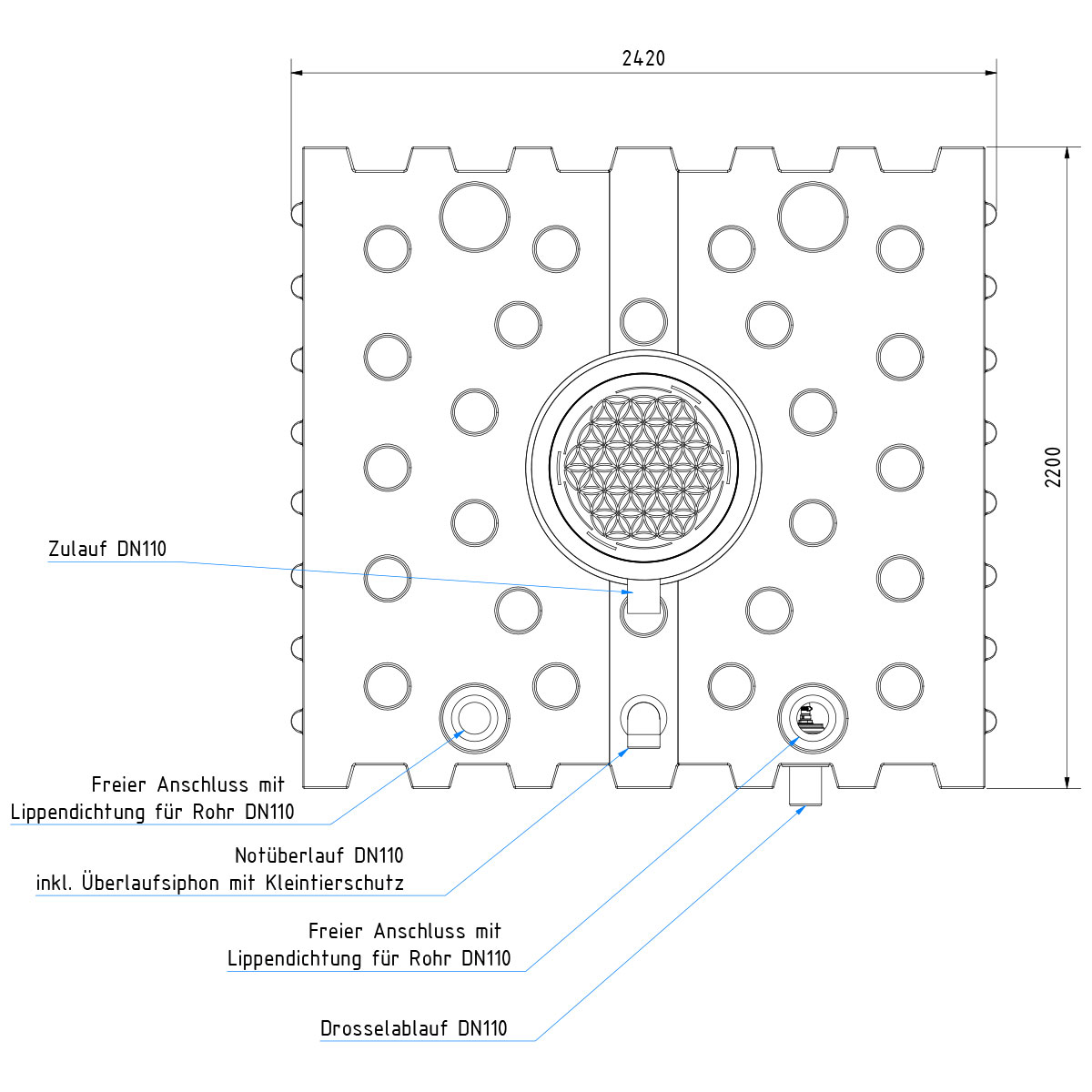 - Überlaufsiphon mit Kleintierschutz (vormontiert)