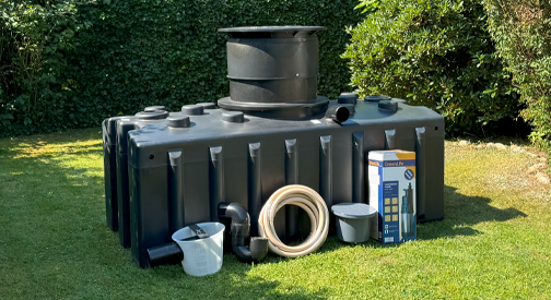 Anschlussfertiges Komplettsystem inkl. Zisterne, höhenverstellbarer Abdeckung, vormontierter Filtertechnik und leistungsstarker Pumpe